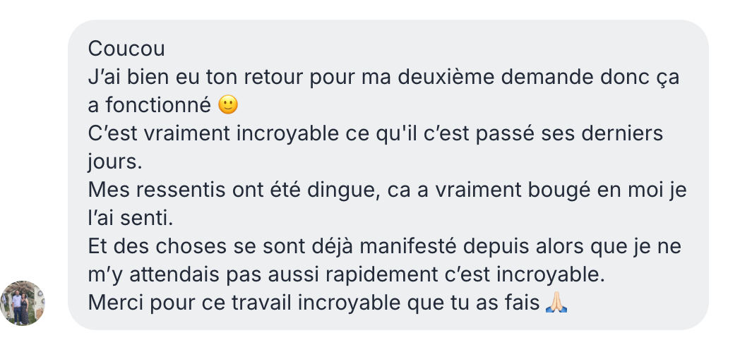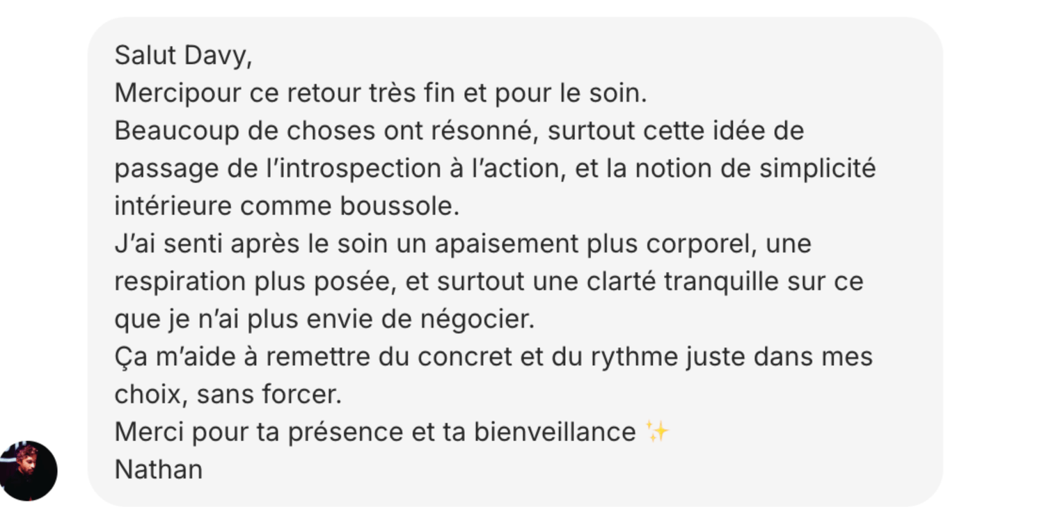 Trois jours après le soin, tu recevras par mail un exercice guidé pour activer ton intention et ancrer l’énergie dans ta réalité.