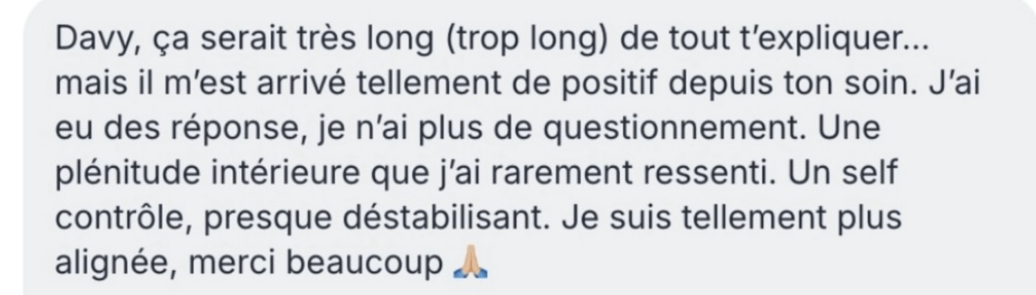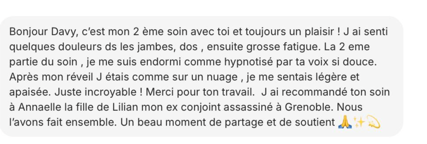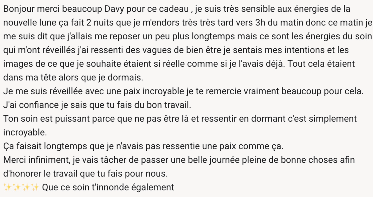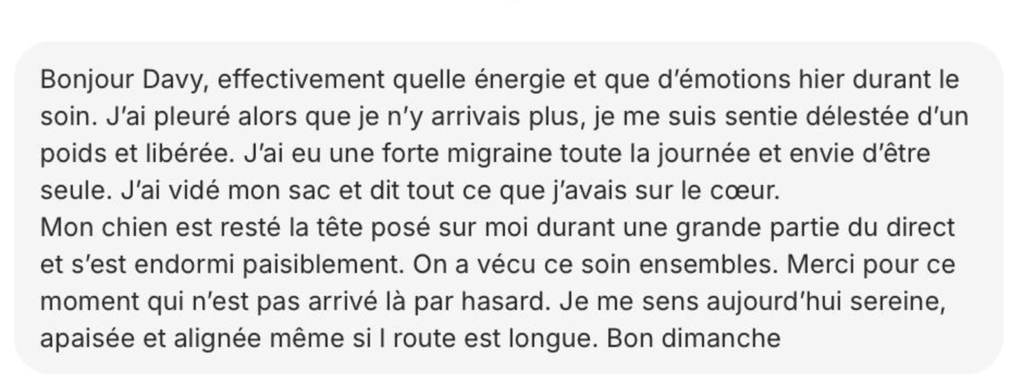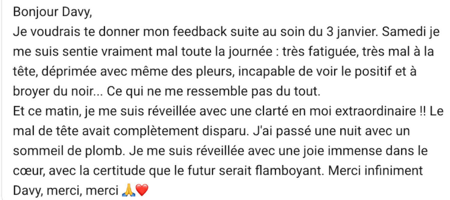 Davy Méditation ne garantit aucun résultat objectif, les effets des soins étant subjectifs, variables, et liés à la réceptivité individuelle.