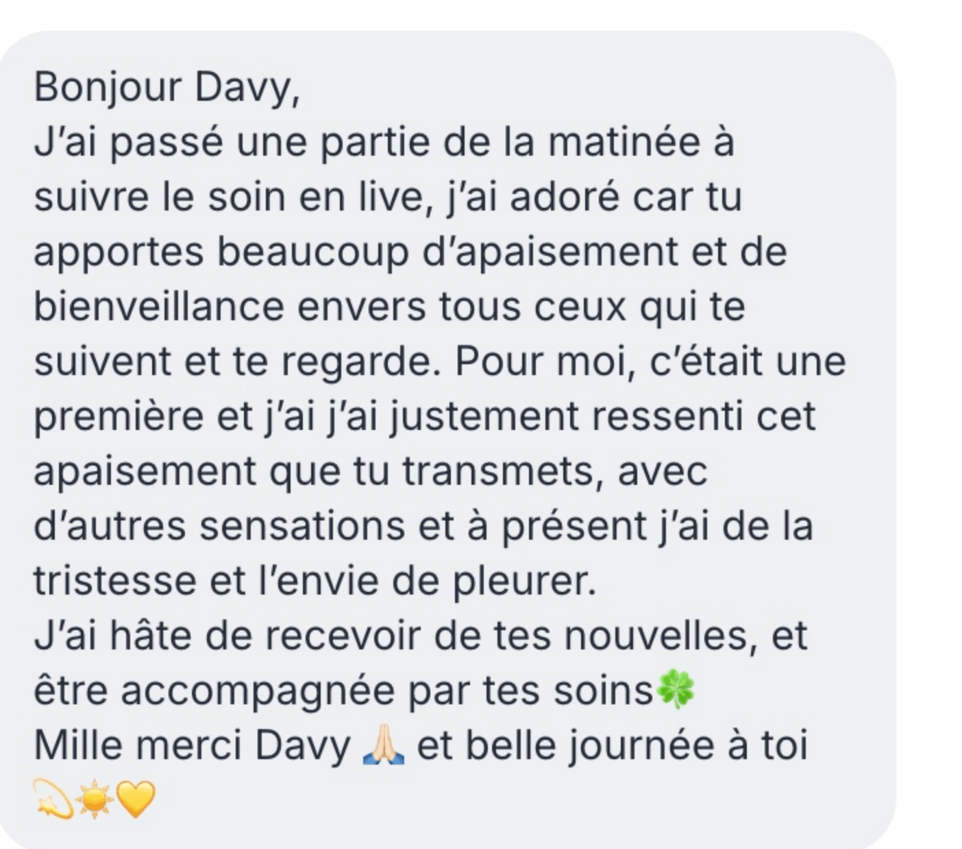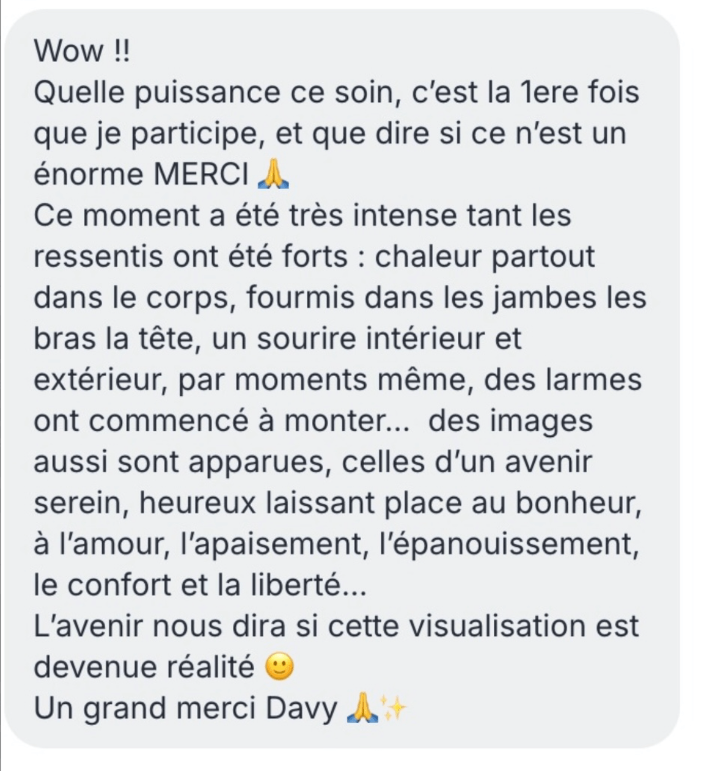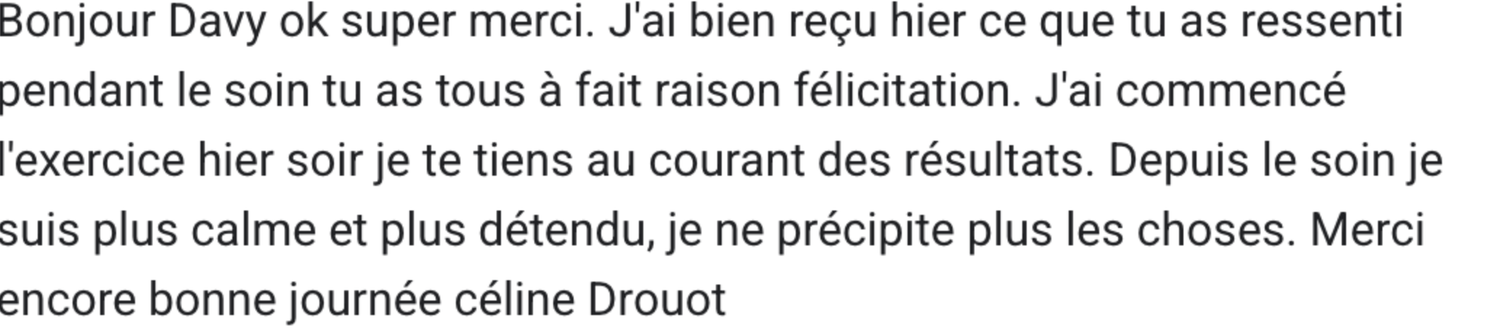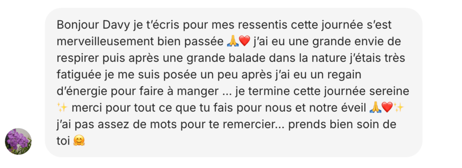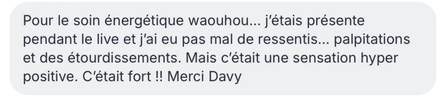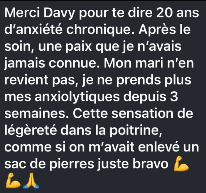 Davy Méditation ne garantit aucun résultat objectif, les effets des soins étant subjectifs, variables, et liés à la réceptivité individuelle.