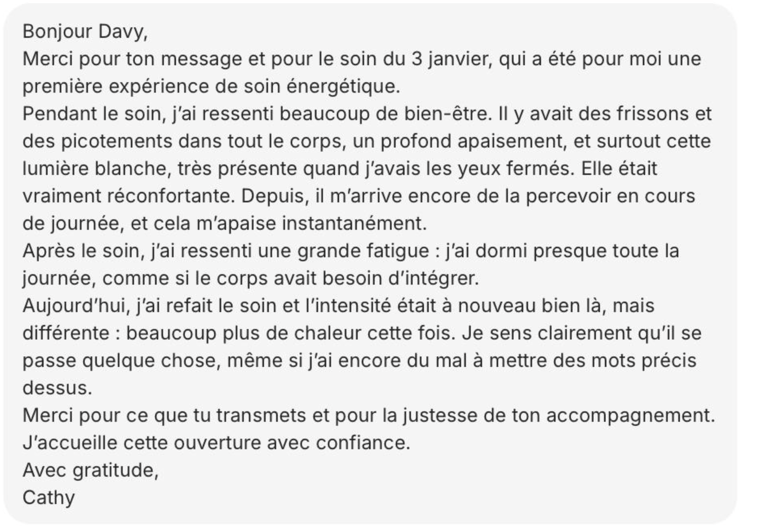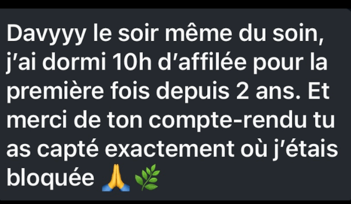 Chaque soin est unique, mais les ressentis convergent : un apaisement profond, une énergie qui circule à nouveau, des synchronicités qui s’ouvrent et des intentions qui se matérialisent plus vite.