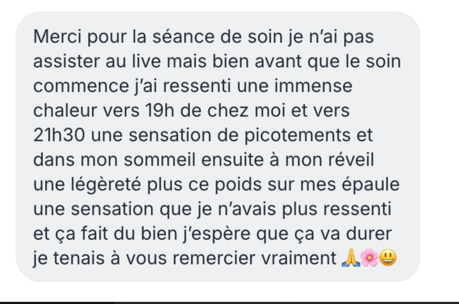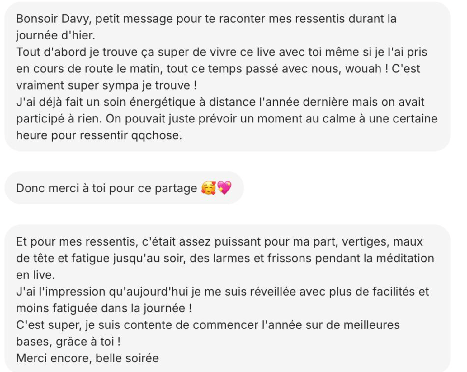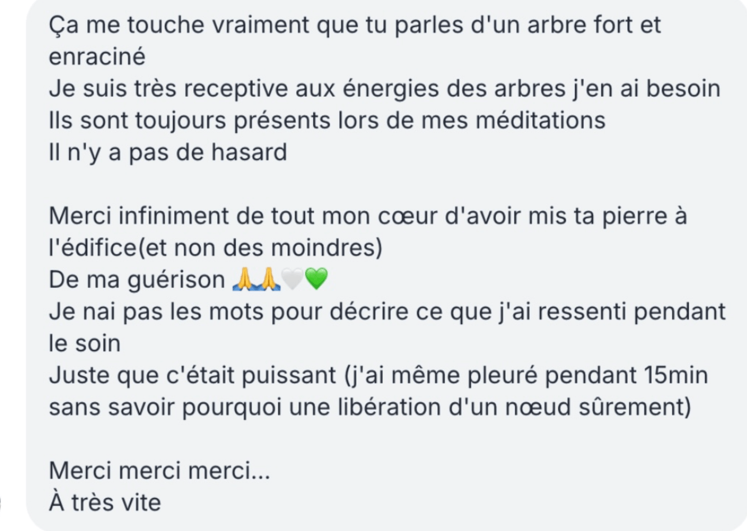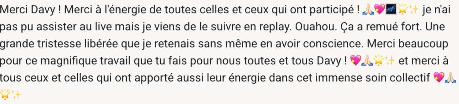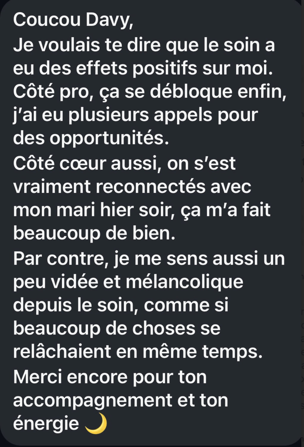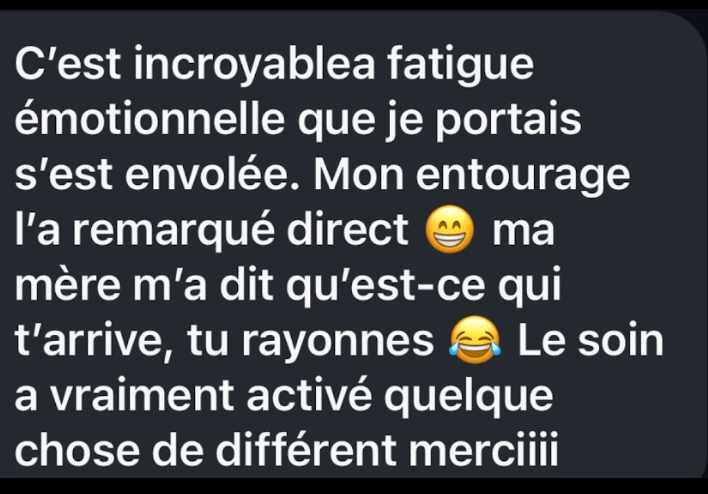 Mes ressentis énergétiques pendant le soin ce que j'ai perçu pour toi, les zones de libération, les ouvertures qui se sont créées.