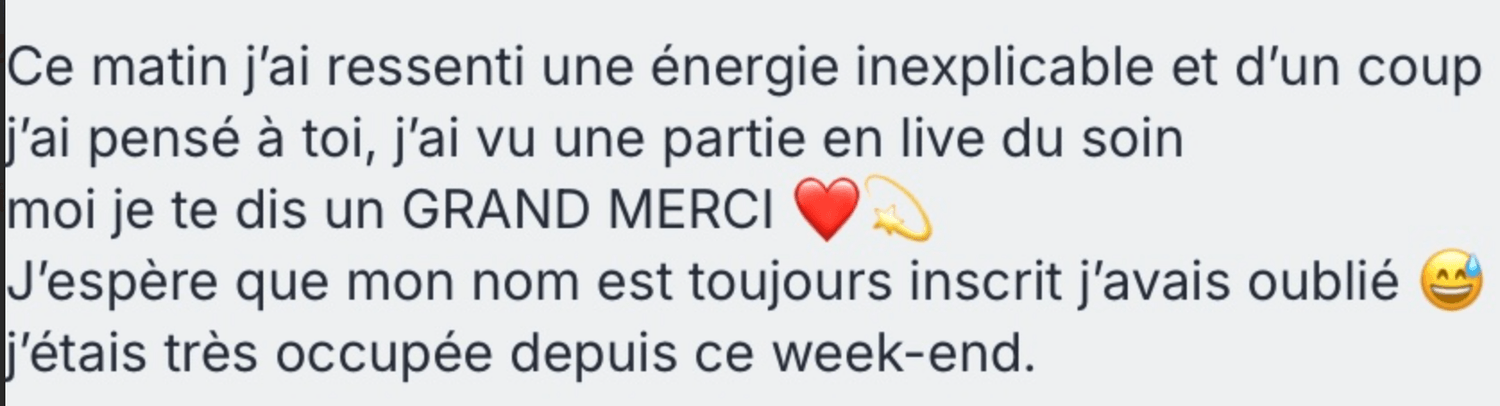Le travail énergétique se fait quoi qu’il arrive, grâce à l’intention que tu poses, au travail que je réalise pour toi, et à la circulation naturelle de l’énergie.